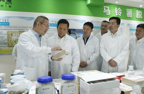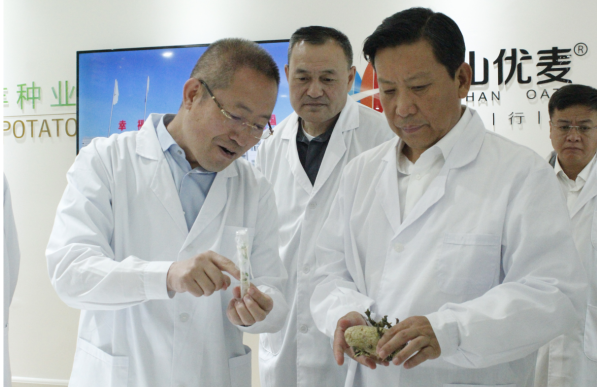 段志強(qiáng)一行首先參觀了民豐種業(yè)脫毒組培中心展廳,詳細(xì)了解了馬鈴薯脫毒種薯生產(chǎn)過程及企業(yè)發(fā)展情況。張國介紹,內(nèi)蒙古民豐種業(yè)有限公司成立于2008年,注冊(cè)資本1.3億元,已累計(jì)完成投資10億元以上,公司已發(fā)展成為集馬鈴薯種薯、訂單薯生產(chǎn)及馬鈴薯、燕麥深加工于一體的全產(chǎn)業(yè)鏈集團(tuán)化企業(yè),是“農(nóng)業(yè)產(chǎn)業(yè)化國家重點(diǎn)龍頭企業(yè)”、“國家高新技術(shù)企業(yè)”、“自治區(qū)扶貧龍頭企業(yè)”。目前,公司已發(fā)展成為一家融合農(nóng)業(yè)和食品加工業(yè)的全產(chǎn)業(yè)鏈集團(tuán)化公司,形成以食品加工帶動(dòng)農(nóng)業(yè),以農(nóng)業(yè)服務(wù)食品加工,一、二、三產(chǎn)融合、農(nóng)商互聯(lián)齊頭并進(jìn)的良性發(fā)展業(yè)務(wù)格局。