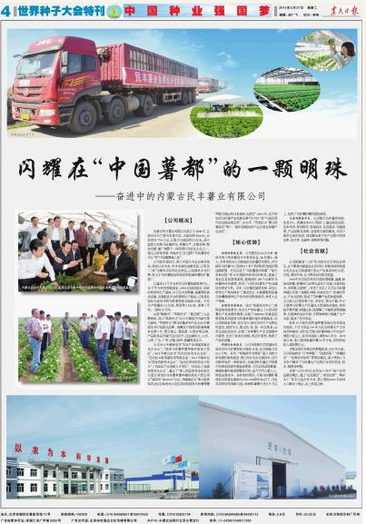 2014年5月27日,農(nóng)民日報(bào)世界種子大會(huì)特刊以 “中國種業(yè)強(qiáng)國夢” 為主題刊登了《閃耀在“中國薯都”的一顆明珠——奮進(jìn)中的民豐薯業(yè)有限公司》一文。